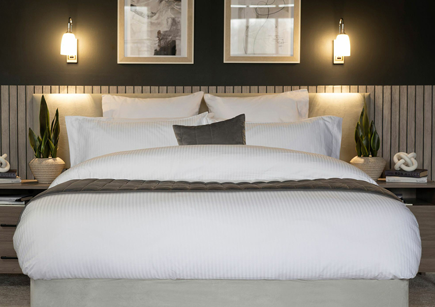 White striped bedsheets specially designed for both hospitals and hotels, combining functionality with an appealing aesthetic.